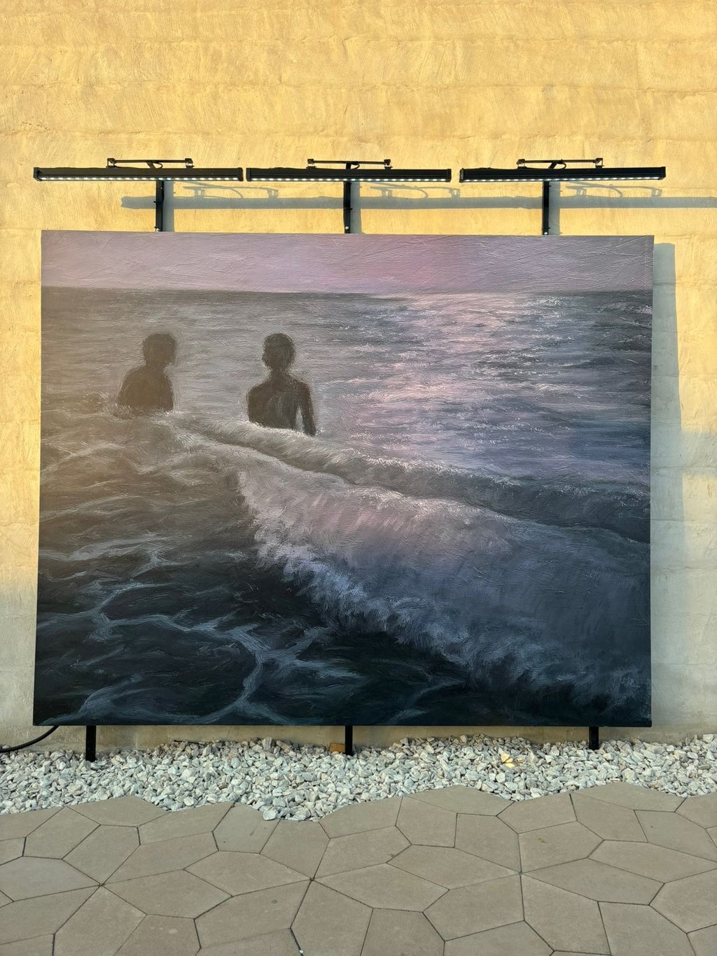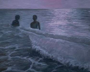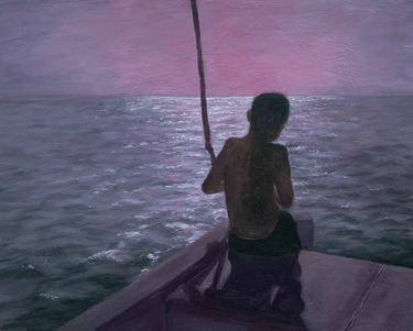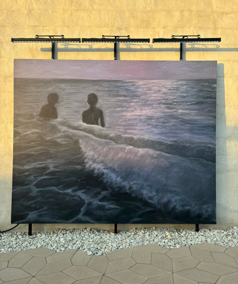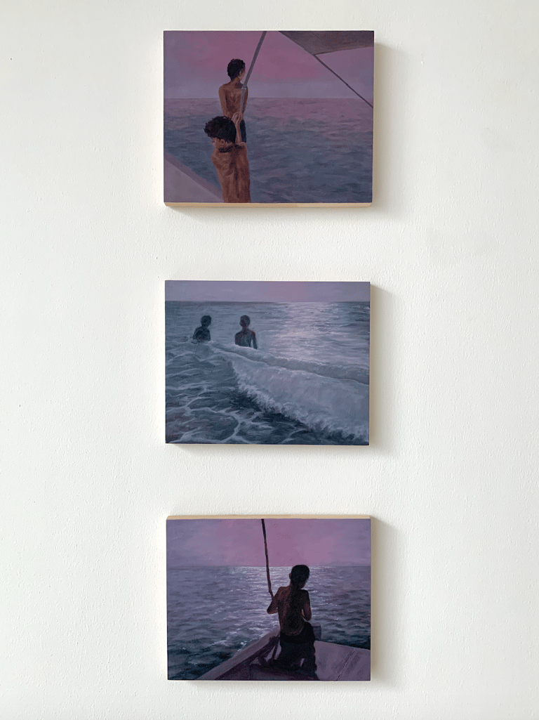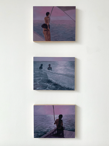 This triptych captures figures at sea, with a dominant purple hue evoking a sense of mystery and introspection. Purple, often associated with spirituality, underscores the emotional journey of the figures.