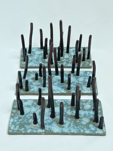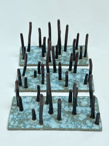 Inspired by the structure and function of mangrove roots, the work consists of three slabs, each carrying a cluster of roots that rise upward from the surface while remaining connected below, grounded in the same earth. Together, they form a system that mirrors how communities exist side by side, distinct but interlinked through quiet forms of support.