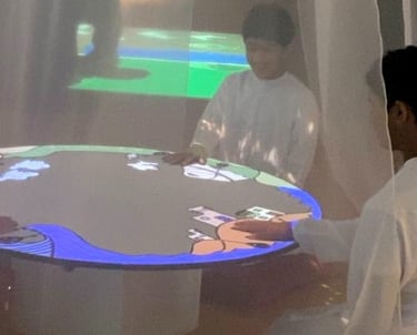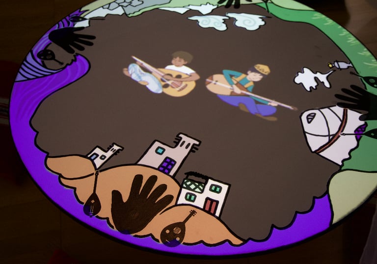 Through this journey, participants are invited to play along with the characters by interacting with the two traditional instruments— the Dombyra and the Oud.