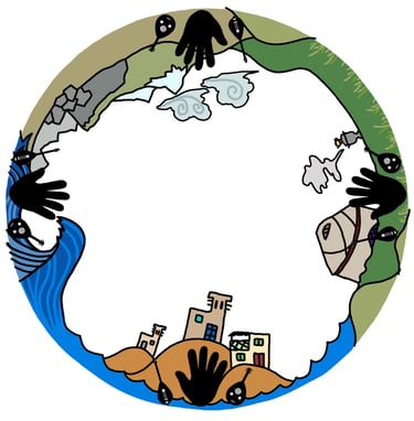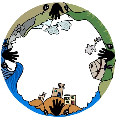Four participants place their hands on the handprints in collaboration to unfold the story.