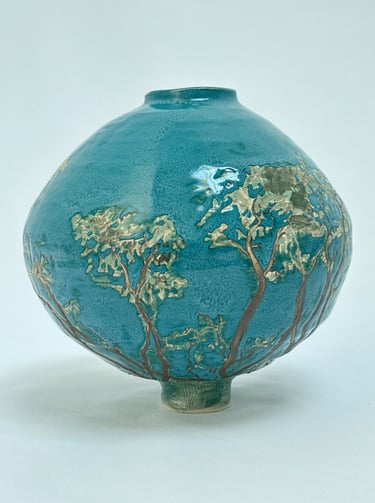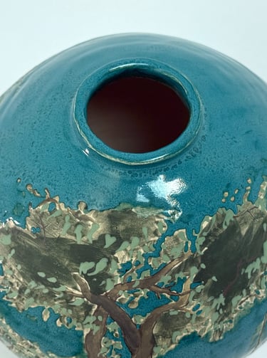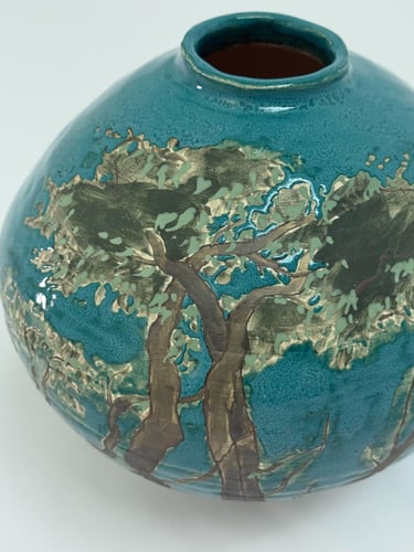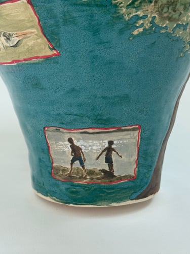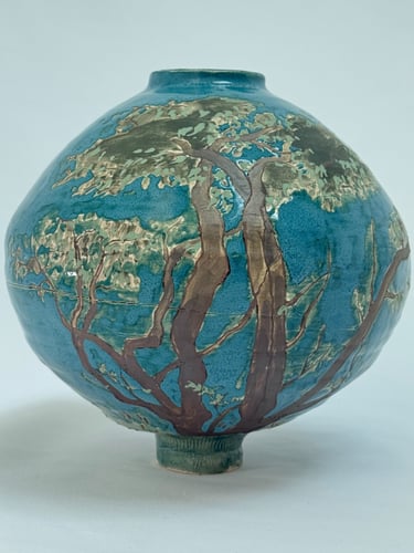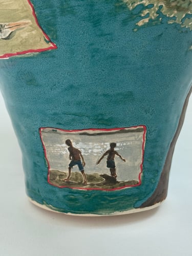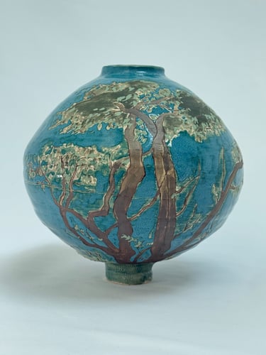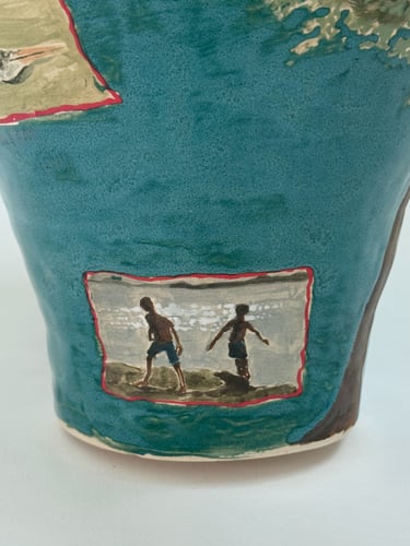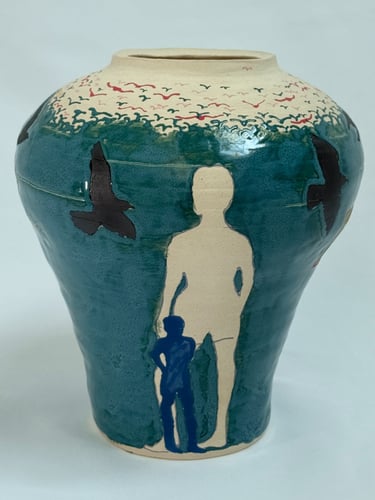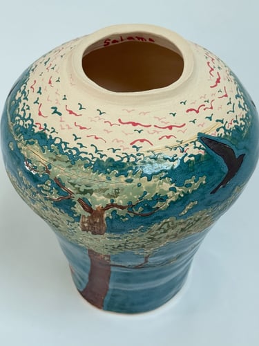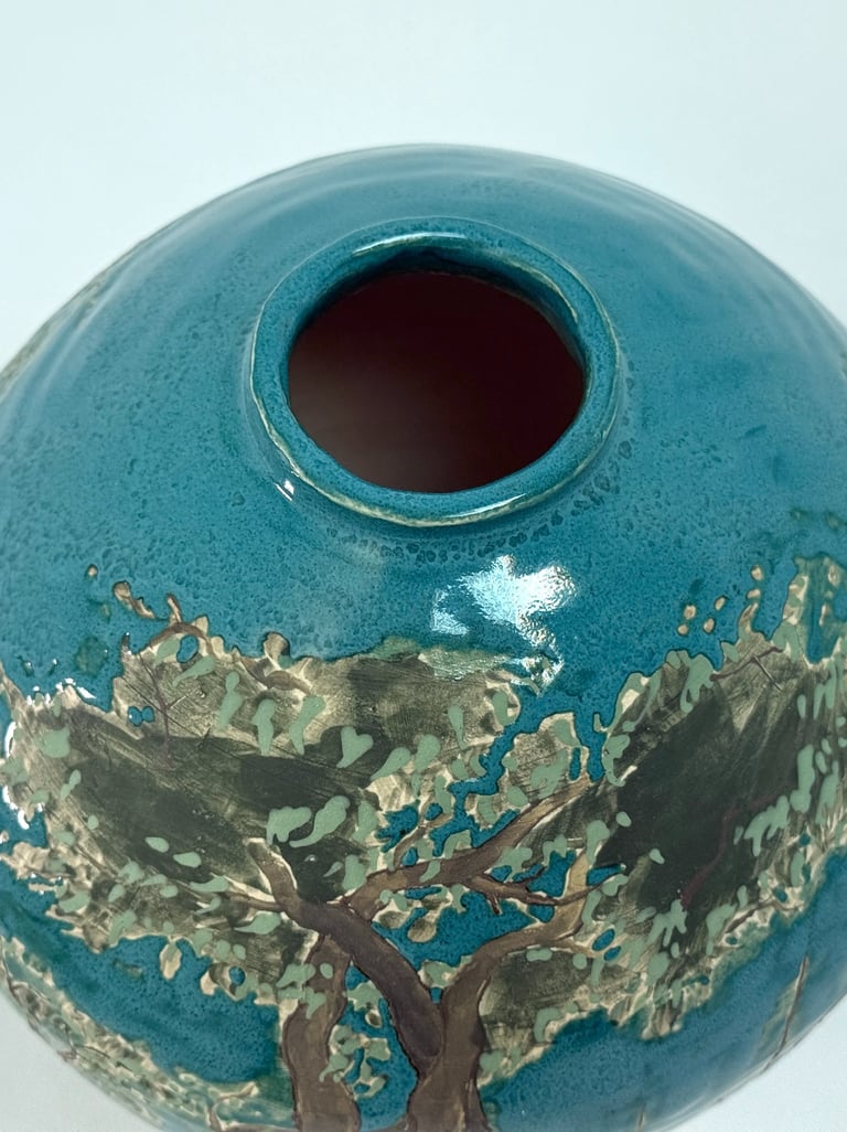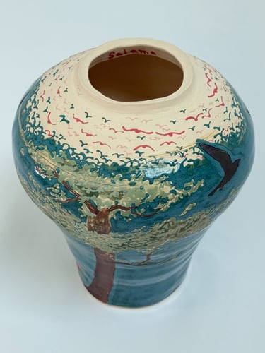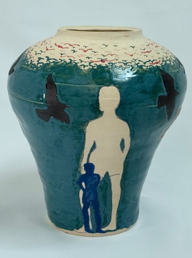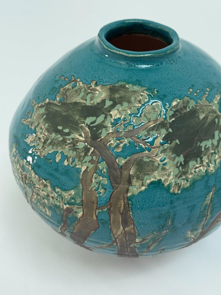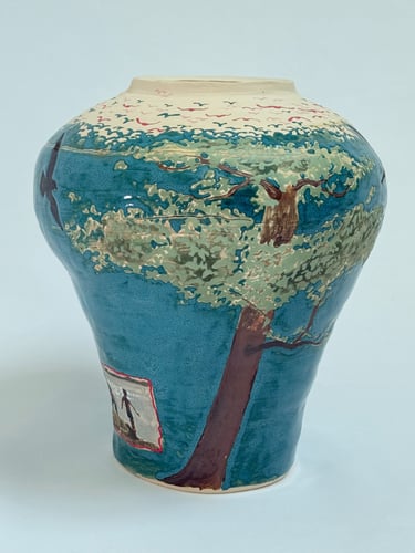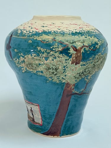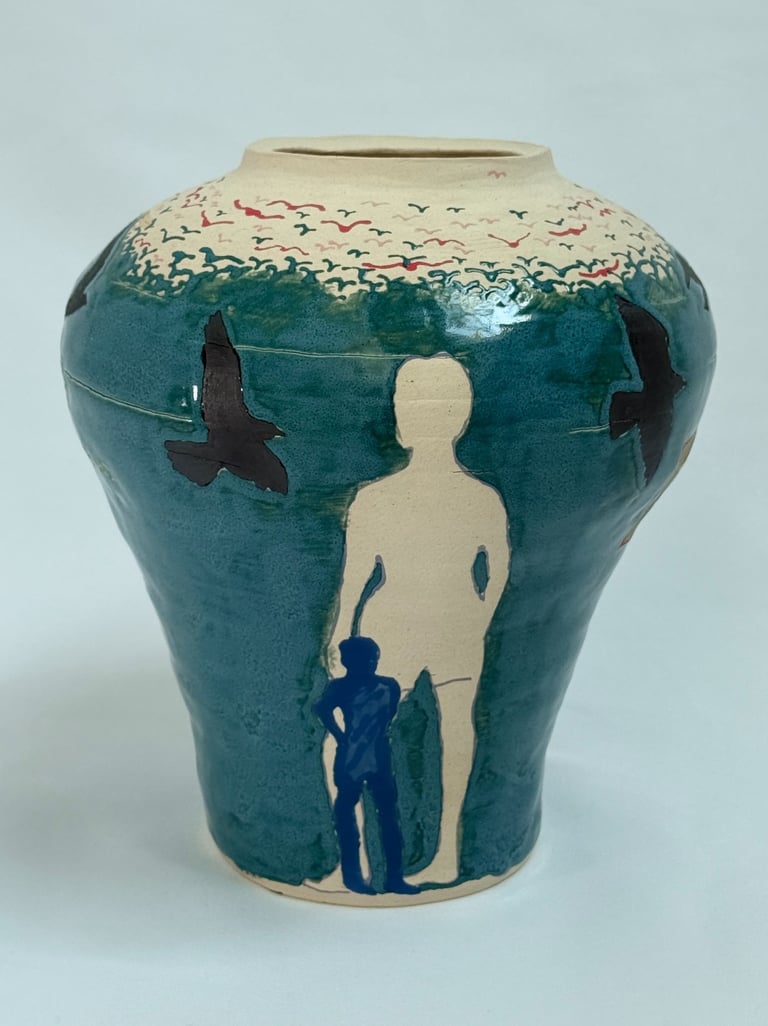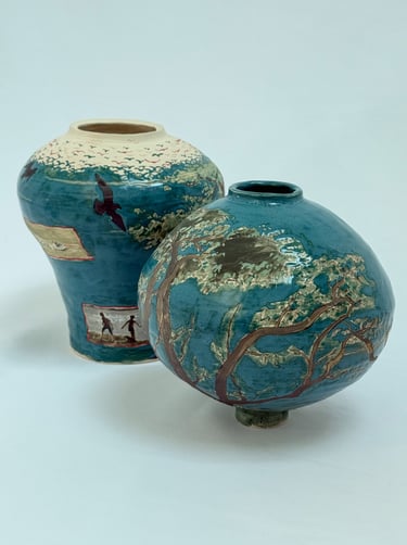 The work began with an interest in narratives and how stories can be told across a single surface. One vase developed from observing tree branches and roots and the structures that sustain life, while the other grew from exploring figures, movement, and traces. The process of painting, glazing, and layering became part of the work itself, shaping the forms and the space they inhabit.